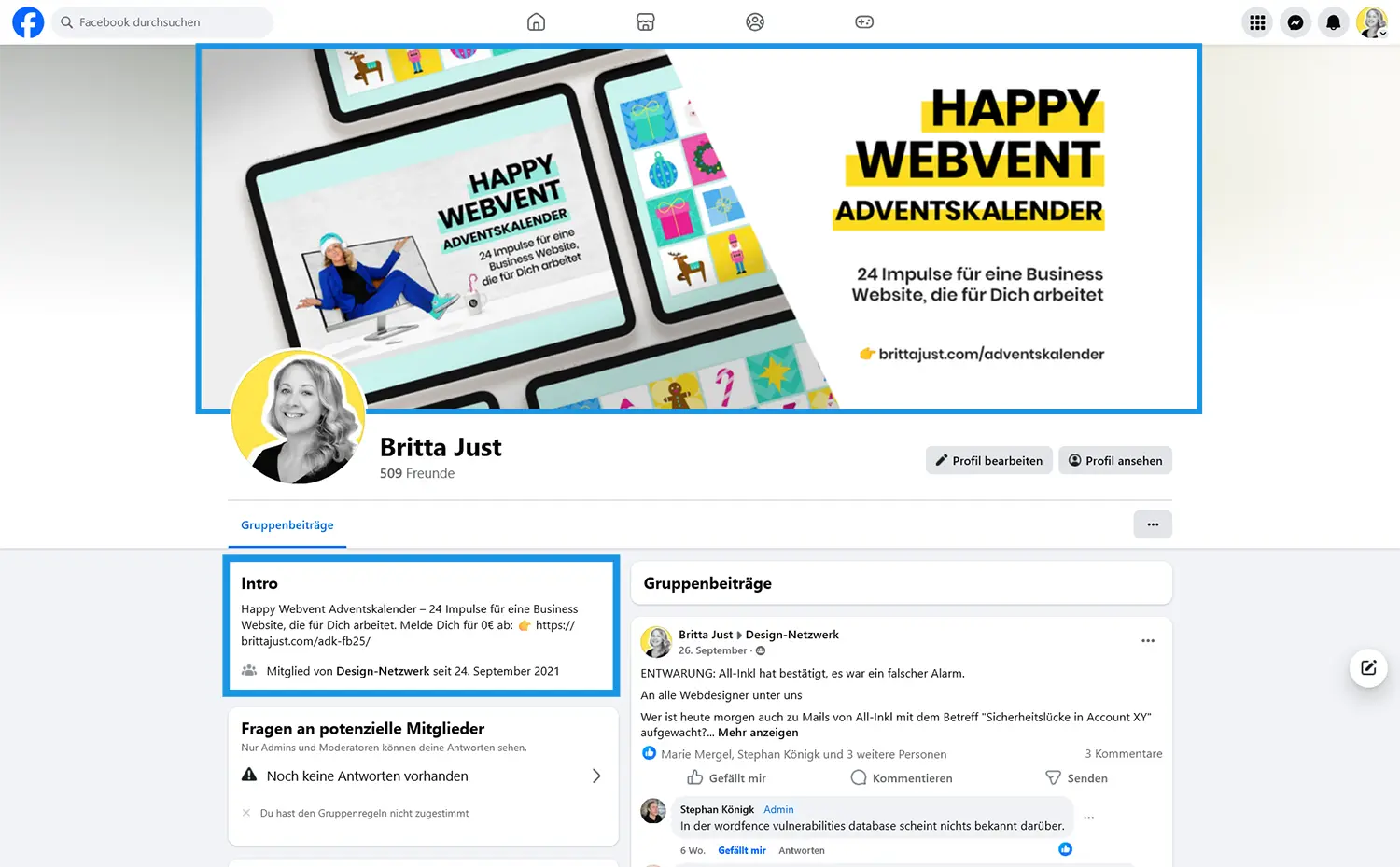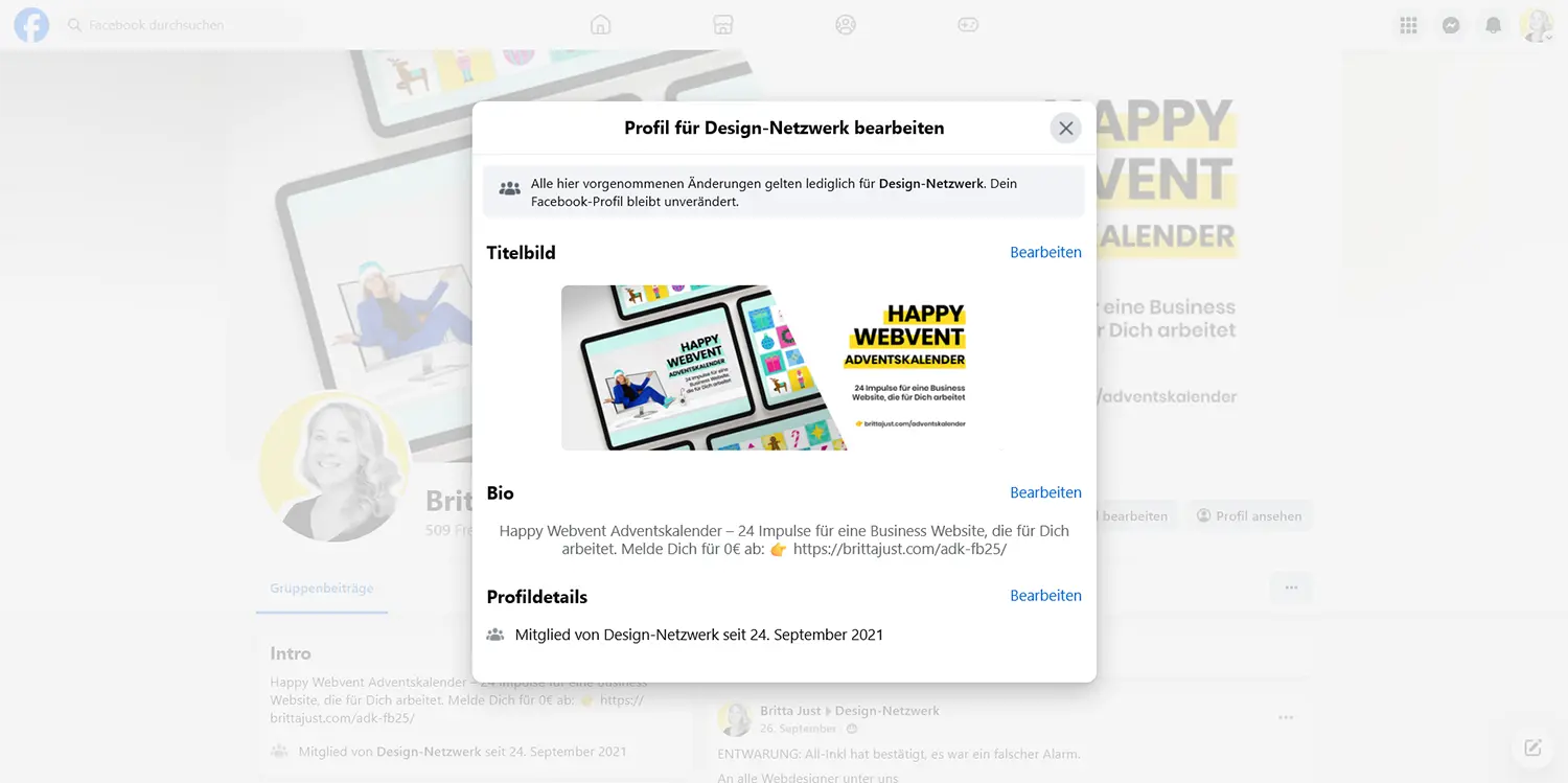 Pro-Tipp: Du kannst auch Dein Gruppenprofil in thematisch passenden Facebookgruppen anpassen. So umgehst Du auch charmant die „No Promotion“-Regel in vielen Gruppen.