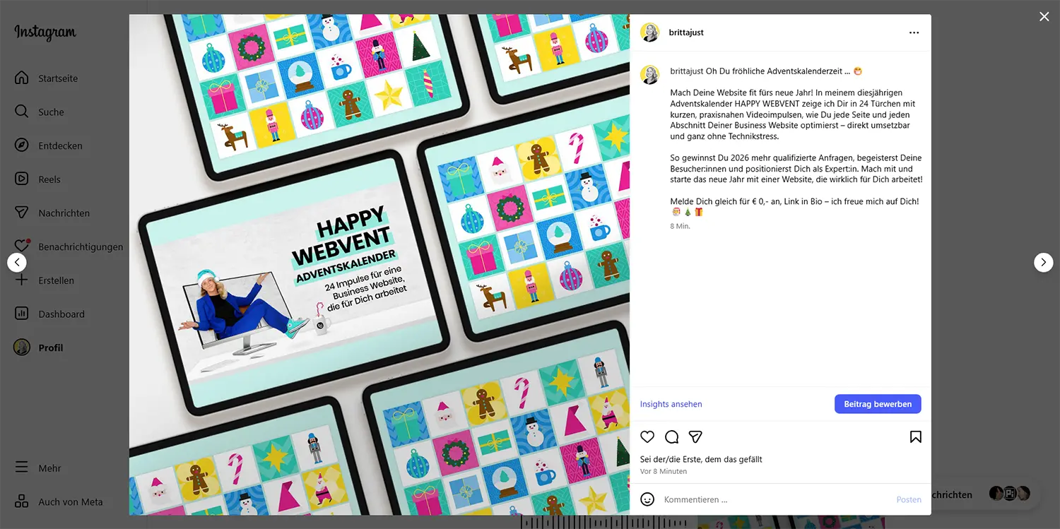 Gestalte mit Canva oder Adobe Express weihnachtliche Profil- und Headerbanner, die Deinen Adventskalender in Szene setzen – das erweckt sofort Aufmerksamkeit. Du kannst außerdem im Profil Steckbrief direkt auf Deinen Adventskalendern verlinken.
