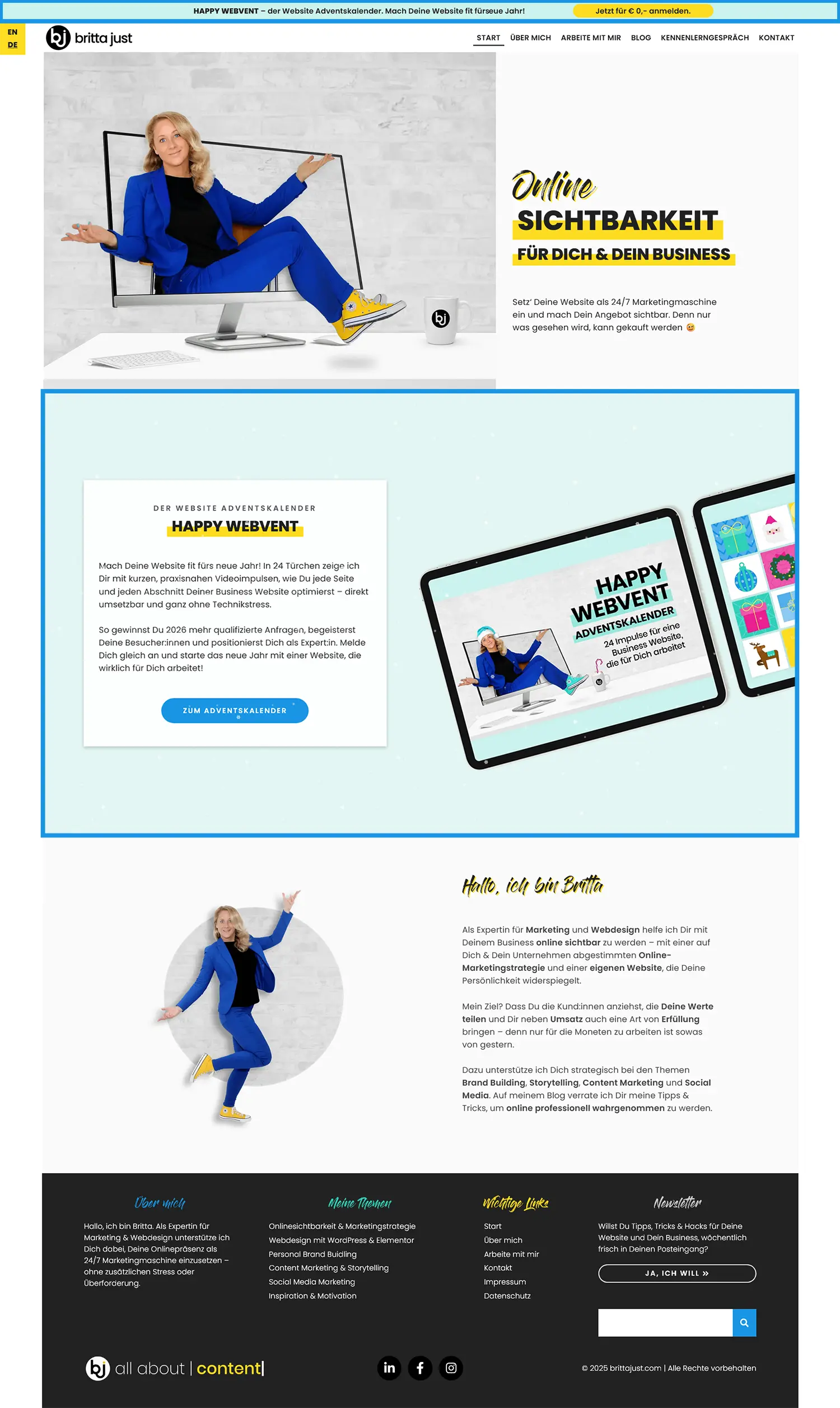 Wenn Du eine Rubrik News oder Aktuelles hast, bringe ihn auch da unter. Das gleiche gilt für Deine Linkliste oder Deinen Linktree. Du kannst auch eine Infoleiste über dem Menü einbauen oder ein Pop-up erstellen, das auf den Adventskalender aufmerksam macht.
