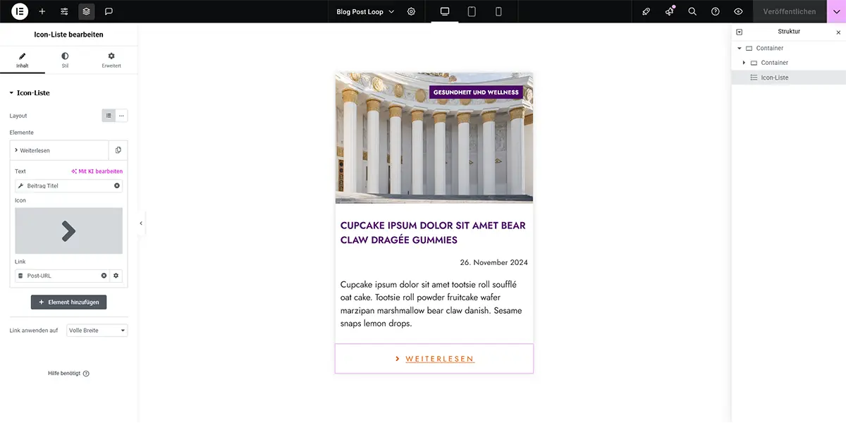 Schritt 2: Als Link wählst Du Post-URL sowie als Text wählst Du den Beitrags Titel als dynmaische Inhalte aus.