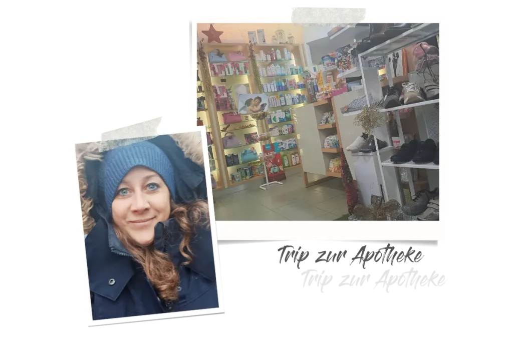 Am späten Nachmittag hört der Regen kurz auf. Ich nutze die Gunst der Stunde, packe mich warm ein und laufe schnell zur Bank und zur Apotheke, mein Rezept einlösen.