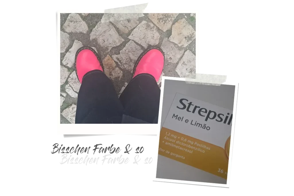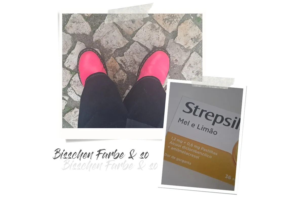 Draußen ist alles Grau in Grau. Umso mehr erfreuen mich meine neonpinken Stiefel. Aus der Apotheke bringe ich auch eine Familienpackung Halstabletten mit, Geschmacksrichtung Honig & Zitrone.